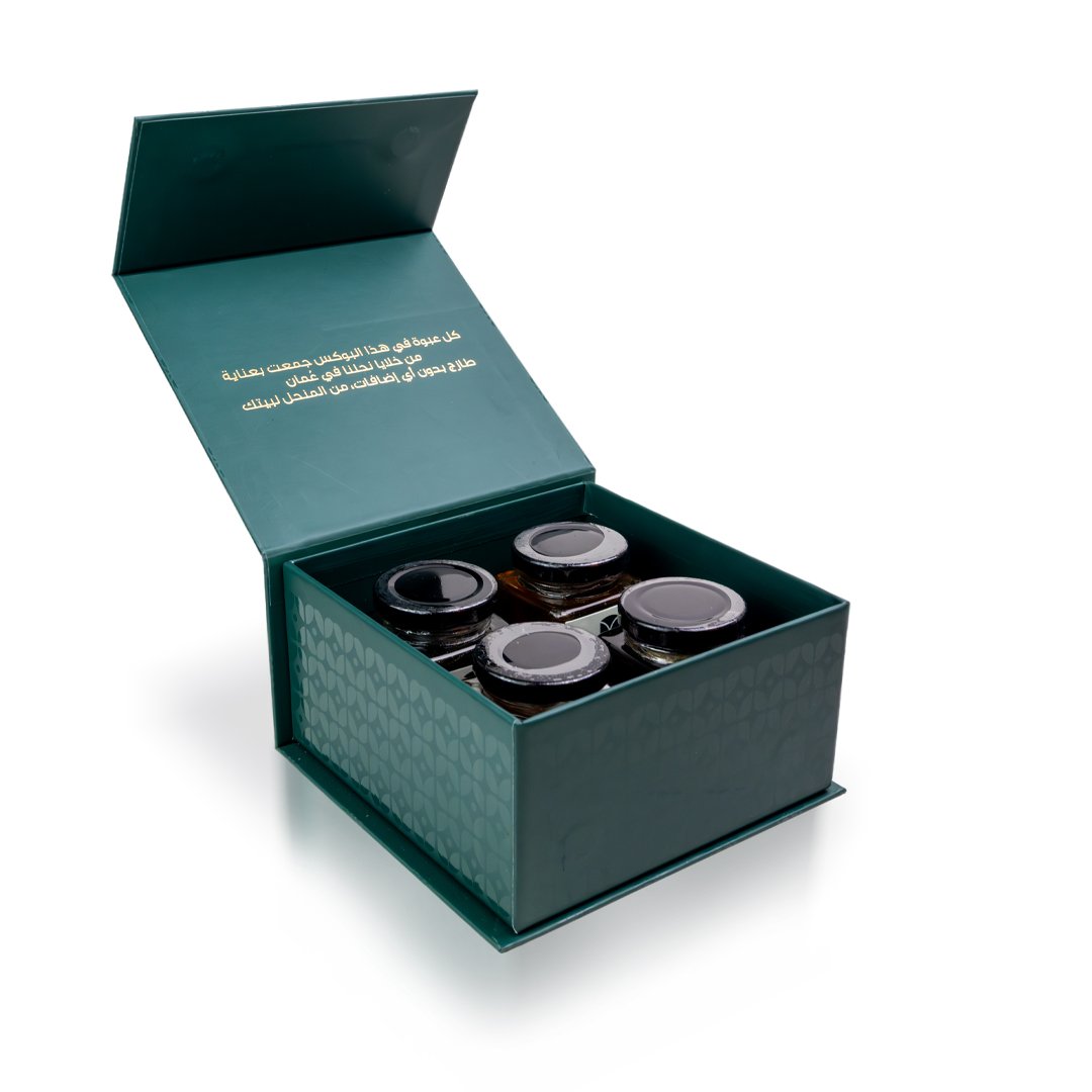باقة نوادر العسل العُماني مصممة لمن يحب اكتشاف أكثر من نوع عسل في صندوق واحد.