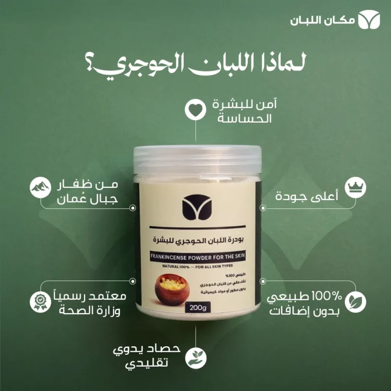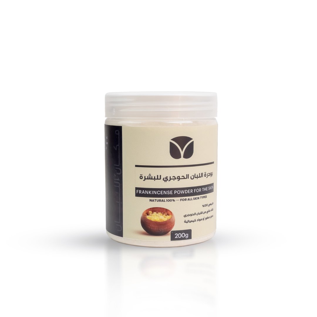 بودرة اللبان الحوجري النقية، من جبال ظفار مطحونة بالدرجة المثالية لماسكات البشرة يدخل في وصفات ماسكات وتونر اللبان، وتحضير منقوع اللبان بطريقة أسرع.